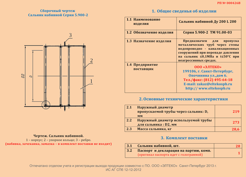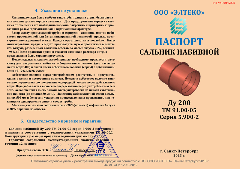 Паспорт качества на сальник набивной содержит следующую информацию: